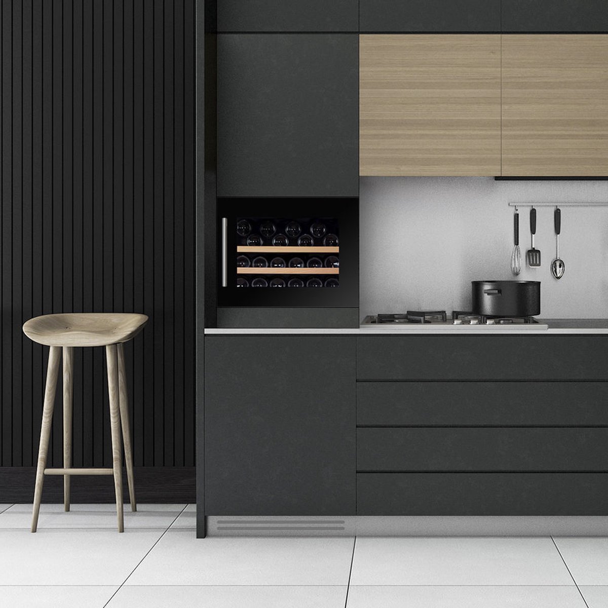 • Een uittrekbare wijnkar met gemakkelijk bereikbare kwaliteitsbewaarders.