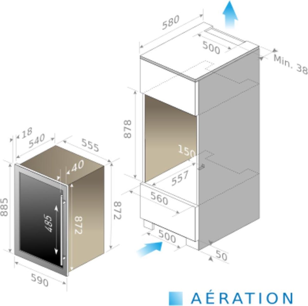 Deze inbouw wijnklimaatkast is ontworpen voor ingebruikname in een kolomkast met een nis van 60 cm breed, 60 cm diep en 88 cm hoog. Voor optimale prestaties moet de omgevingstemperatuur tussen 16°C en 32°C liggen.
