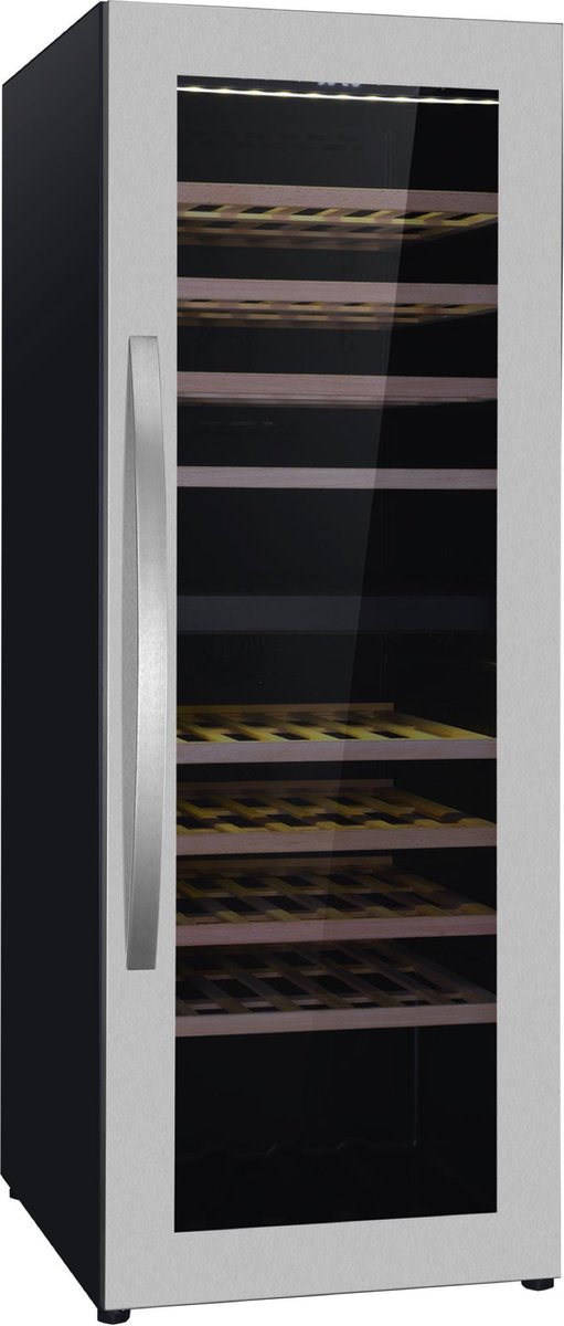 Deze wijnklimaatkast is vrijstaand, maar kan ook in een nis worden ingebouwd, mits er voldoende ventilatieruimte boven en aan de zijkanten is. Met afmetingen van 128,5 cm hoog, 50 cm breed en 59,5 cm diep past hij gemakkelijk in verschillende ruimtes – van woonkamer tot wijnkelder.