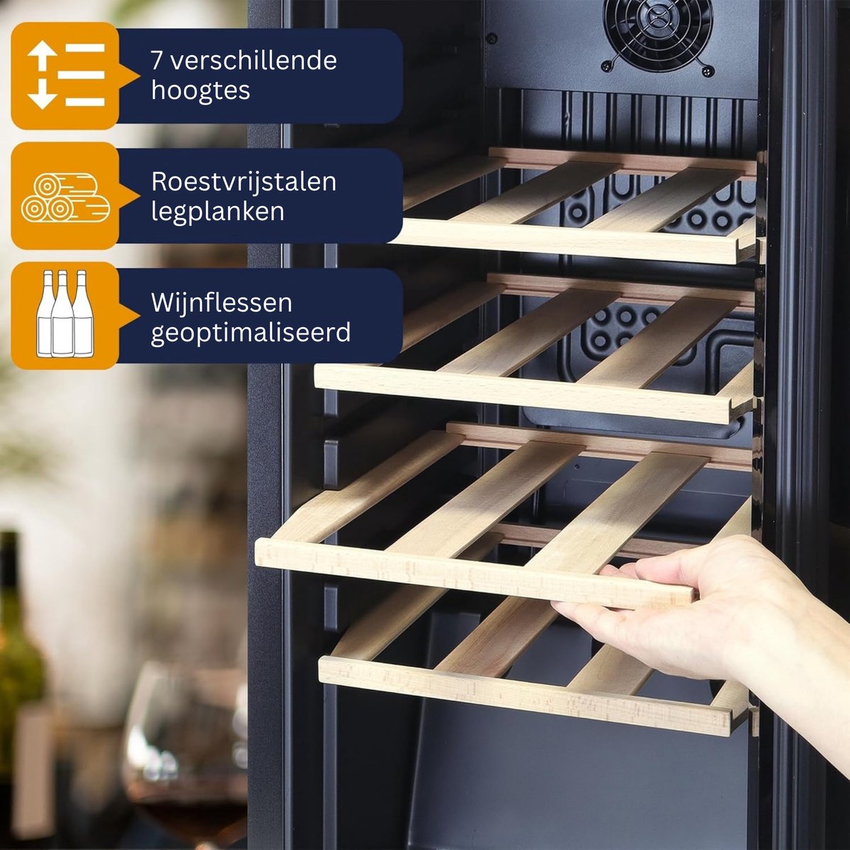 Er kunnen maximaal 15 standaard wijnflessen in geplaatst worden, met een optioneel uitbreidingsmogelijkheid tot 20 flessen.